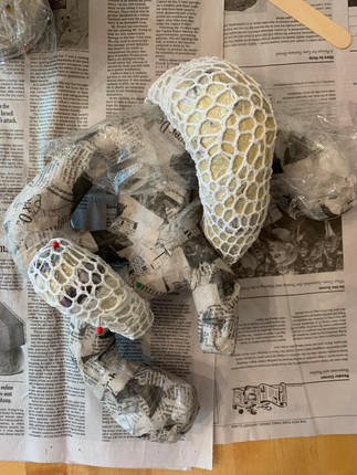 So far on my project, I have paper mached a shape for my sculpture. To work on the crochet part, I made forms out of news paper and made crochet pieces to fit around it. To make them stiff, I covered them in glue and left them on the forms. Now, I am working on covering the paper mache form with encaustic. The process that I have been using is spreading the encaustic on, not worrying about the smoothness and then going back through later with a heat gun to smooth it out. After I finish this part, I am going to polish the encaustic by rubbing it with a cloth and then I will attack the crochet pieces.