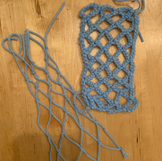 This week I started out with attempting to attach some fabric to the walls and ceiling of the room I'm using into the shape of a wave. I did this by poking a hole into the fabric and then sticking a screw through that and screwing it into the wall. I didn't plan what I was doing very much so because of that it doesn't look amazing. The main problem I realized from just hanging it onto the wall is that it is very difficult to get the shape I want just with the fabric. I have started collecting big cardboard boxes and I think that those will be just structural enough to hold the shape I want but also be something that I can bend and glue things on top. I have also been experimenting with different textures that I can use for fabrics in the waves. I learned to crochet a grid like pattern, but am also thinking about tying knots between strings (probably thicker than the ones I used) to make a similar pattern that takes less time.