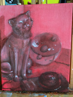 So far I have finished the brunei underpainting and have begun to add color. I've done most of the first layer of color. Next I am going to add more layers to each of the areas to adjust the color. The most finished area is the camera but it still needs some work to become more defined. Some things that I really want to make sure I do are lightening the cat, changing the background colors so that one wall is darker, and adding more variance into the shades in the cardboard to make it more like cardboard.